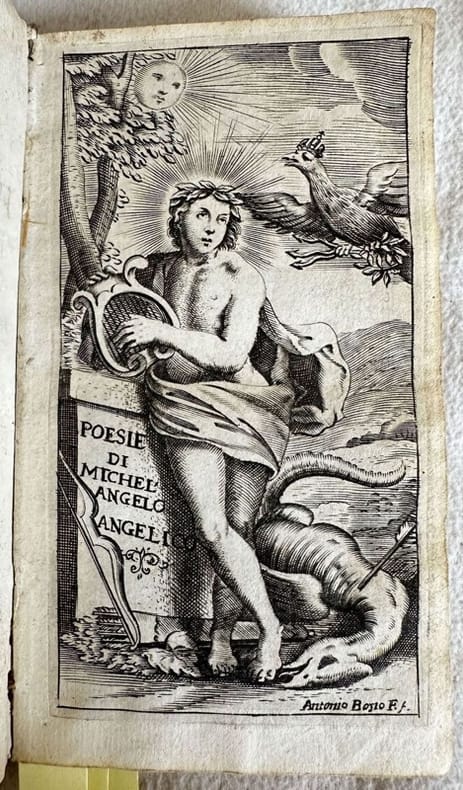 Edizione originale del 1665 di questa opera poetica di Michelangelo Angelico (sec. 16/17) poeta della cerchia dei letterati che animarono l'Accademia Olimpica con lo pseudonimo di Cintio Pierio (Cfr. Romei D., Poesia satirica e giocosa nell'ultimo trentenno del Cinquecento, in "nuovo Rinascimento", 1998, p. 21). Firma datata 1704 alla prima carta bianca. Bella incisione calcografica in antiporta incisa da Antonio Bosio (1646-1694). Dedica a Leopoldo I. Tra i versi presenti: A Suor MArgherita Arnaldi priora a Vicenza, Giovanni Moresini di Chioggia, CEsare Piovene, perl'inondazione del Danubio, Amante che si trattiene in Campo Marzio di Vicenza, Niccolo Mocenico rettore di Brescia ec.. Alla fine "In morte del Signor Luigi Grimani". In ottime condizioni. Copertina in piena pergamena con titolo manoscritto al dorso in buone condizioni generali con lievi usure ai margini e dorso. Legatura in buone condizioni. All'interno le pagine si presentano in buone condizioni con rare fioriture. In 24. Dim. 13,5x8. Pp. 213+(15).Original edition of 1665 of this poetical work by Michelangelo Angelico (sec. 16/17) poet of Accademia Olimpica with the pseudonymous of Cintio Pierio (Cfr. Romei D., Poesia satirica e giocosa nell'ultimo trentenno del Cinquecento, in "nuovo Rinascimento", 1998, p. 21). Signature dated 1704 in the first blank page. beautiufl calcographic engraving in the frontspice by Antonio Bosio (1646-1694). Dedication to Leopoldo I. The poems inside: A Suor MArgherita Arnaldi priora a Vicenza, Giovanni Moresini di Chioggia, CEsare Piovene, perl'inondazione del Danubio, Amante che si trattiene in Campo Marzio di Vicenza, Niccolo Mocenico rettore di Brescia ec.. Alla fine "In morte del Signor Luigi Grimani". In very good conditions. Parchment cover with handwritten title in the spine in good conditions lightly worn in the extremities. Binding in good conditions. Inside pages are in good conditions with occasional foxing.In 24. Dim. 13,5x8. Pp. 213+(15).