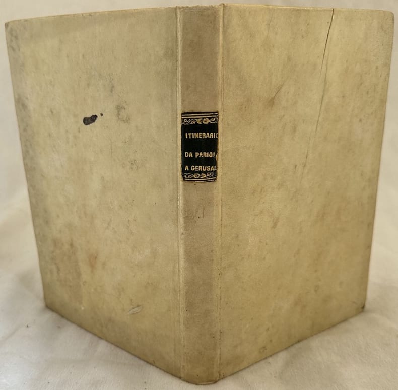 Edizione italiana del 1844 di questa opera di viaggio dello scrittore politico diplomatico e storico francese Francois Renè de Chateaubriand (1768-1848). Nell'anno 1806 intraprese un viaggio per concretizzare il progetto letterario di una epopea cristiana: attraversò la Grecia, Asia Minore, Palestina, Egitto fino ad arrivare in Spagna. Gli appunti che raccolse durante il viaggio vennero elaborati nell'opera "L'itinerarire de Paris a Jerusalem", pubblicata per la prima volta nel 1811. In ottime condizioni. Copertina in pergamena coeva con titolo in oro al dorso in buone condizioni generali con lievi usure ai margini e dorso. Legatura in buone condizioni. Pagine in buone condizioni con rare fioriture. In 8. Cm 22,5x16,5. Pp. 280. Italian edition of 1844 of this work of travel byt he french writer politician diplomat and hystorian Francois Renè de Chateaubriand (1768-1848). During the year 1806 he made a travel for the literary project of a christian epopea: he went through Greece, Asia Minore, Palestine, Egypt to get to Spain. The notes collected during the travel were elaborated in the work "L'itinerarire de Paris a Jerusalem", published for the first time in 1811. In very good conditions. Parchment coeval cover with gilted title in the spine in good general conditions lightly worn in the extremities. Binding in good conditions. Pages in good conditions with occasional foxing. In 8. Cm 22,5x16,5. Pp. 280.<BR><BR> <BR><BR> <BR><BR> <BR><BR><BR>