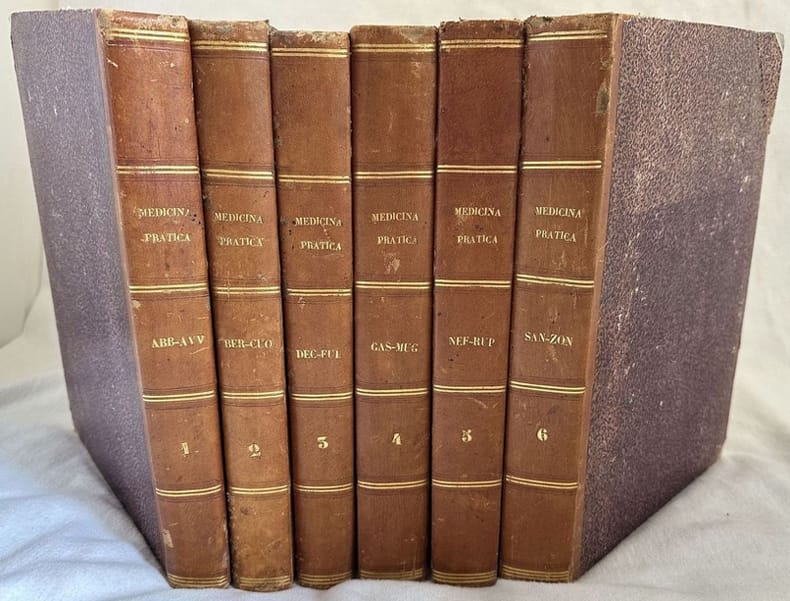 Edizione italiana del 1860 di questo compendio di medicina pratica scritto da Luigi Delaberge, Eduardo Monneret e Luigi Fleury. Traduzione a cura di Raffaele Biondi. L'opera è composta da sei tomi ed è completa. Disposta in forma di dizionario è un esposizione analitica ragionata dei lavori contenuti nei principali trattati di patologia interna. Alla fine del sesto tomo appendice di Anatomia patologica, anatomia topografica, aneurismi, ascoltazione, malattia di Bright, Cancrena secca, diabete, febbri, leucocitemia o leucemia, malattie della pelle, uremia ecc.. Elegante legatura in mezza pelle decorata in oro. In buone condizioni. Copertina in mezza pelle con titolo e decorazioni in oro al dorso in buone condizioni generali con lievi usure ai margini e dorso. Legatura in buone condizioni. Pagine in ottime condizioni con rare fioriture. In 4. cm 31x22. Pp. XII+611, 663, 709, 884, 790, 728+CX Peso Kg. 9,500. Italian edition of 1860 of this resuming of pratical medicine written by Luigi Delaberge, Eduardo Monneret and Luigi Fleury. Translation by Raffaele Biondi. The work is in six volumes and it is complete. Italian version by Raffaele Biondi. The work is in form of dicitonary and is an analitic exposition of works contained in the greatest part of internal pathology. At the end of ther sixth tome appendix of patological antomy, topographical anatomy, aneurisms, hearing, desease of Bright, Cancrena secca, diabet, fevers, leucocitemia o leucemia, desease of skin, uremia ecc.. Nice half leather coeval cover with gilted decorations. In good conditions. Half leather binding with gilted title and decorations in the spine in good general conditions lightly worn in the extremities. Binding in good conditions. Pages in very good conditions with occasional foxing. In 4. cm 31x22. Pp. XII+611, 663, 709, 884, 790, 728+CX Peso Kg. 9,500. <BR><BR>