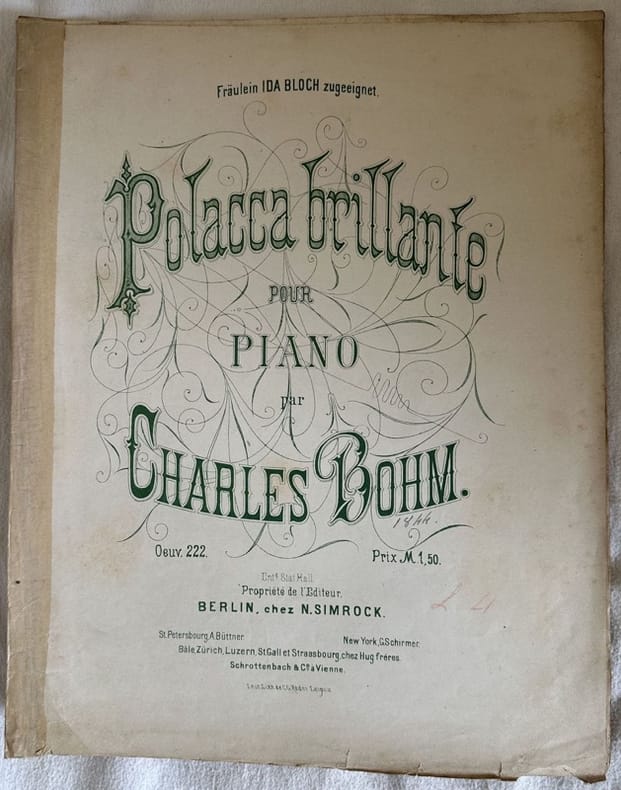 Prima edizione del 1877 circa (numero 7909) della melodia "Polacca Brillante" dall'opera 222 del compositore e pianista tedesco Charles Bohm (1844-1920). Bohm è considerato uno dei più importanti compositore di canzoni del XIX secolo. Bel frontespizio figurato In buone condizioni. Copertina editoriale in buone condizioni con lievi usure marginali. Legatura editorialmente assente. Pagine in buone condizioni con fioriture. In Folio. cm. 34,5x27. Pp. 10First edition of 1877 circa (number 7909) of the melody "Polacca Brillante" from the work 222 by the german composer and piano player Charles Bohm (1844-1920). Bohm is considered one fot he most important composer of songs of XIX century. Beautiful figurated title page. In good conditions. Editorial cover in good conditions lightly worn in the extremities. Binding editoriarly lacks. Pages in good conditions with foxing. In Folio. cm. 34,5x27. Pp. 10