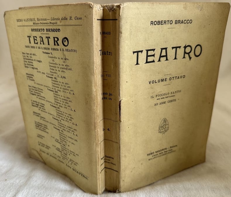 Edizione del 1912 di questo volume di questa raccolta di opere teatrali del giornalista scrittore drammaturgo italiano Roberto Bracco (Napoli 1861-Sorrento 1943). Siamo in possesso del volume ottavo contenente le seguenti opere: Il piccolo Santo con nota dell'autore, Ad Armi corte. In buone condizioni. Copertina editoriale in buone condizioni con lievi usure marginali. Legatura in discrete condizioni con rotture. Pagine in buone condizioni con rare fioriture. In 8. cm 19,5x13,5. Pp. 357+15Edition of 1912 of this volume of this collection of theatre work by the jorunalist writer and dramawriter Roberto Bracco (Napoli 1861-Sorrento 1943). We have the eight volume containing the following works: Il piccolo Santo with note of the author, Ad Armi corte. In good conditions. Editorial cover in good conditions lightly worn in the extremities. Binding in fair conditions with cracks. Pages in good conditionswith occasional foxing. In 8. cm 19,5x13,5. Pp. 357+15.