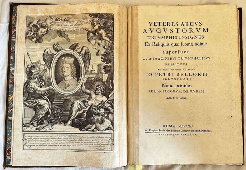 Splendido volume illustrato del 1690 sull'Arco di Augusto a Roma di Pietro Giovanni Bellori (1613-1696) commissario per le antichità di Roma sotto Papa Clemente X, antiquario e bibliotecario di Cristina di Svezia. Bellori fu uno dei biografi più importanti degli artisti del barocco italiano. Antiporta finemente illustrata con dedica al Cardinale Pietro Ottoboni (pro nipote di Papa Alessandro VIII). All'interno 48 finissime incisioni su 46 tavole numerose delle quali a doppia pagina mostrano dettagli degli Archi di Augusto. "Può quest'opera ritenersi per la più bella in questo genere, e classica specialmente per la magnificenza ed eleganza delle stampe, che sono il capo d'opera di Pietro S. Bartoli..." (Cfr. Cicognara (3608). In ottime condizioni. Coperta in piena pelle settecentesca con titolo e ricche decorazioni in oro al dorso e piatti in buone condizioni generali con lievi usure marginali. Piccola rottura alla cerniera della cuffia inferiore. Legatura in buone condizioni. All'interno le pagine si presentano in buone condizioni con fioriture. Restauro al margine di piegatura dell'antiporta. In folio. cm 48,5x36. Pp. (4)+2+(1)+16-19+(1)+46 pl. Peso Kg. 2,600Very beautiful illustrated volume of 1690 about Augustus Arch in Rome written by Pietro Giovanni Bellori (1613-1696) commissionary for antiquities of Rome under the Pope Clemente X, antiquarian and librarian of Cristina di Svezia. Bellori was one of the most important biographer of artists of italian barocco. Frontspice finely engraved with dedication to the Cardinal Pietro Ottoboni (grand nephew of the Pope Alessandro VIII). Inside there are 48 fvery fine engravings on 46 plates many of them in double page showing detains of August Arch. "Può quest'opera ritenersi per la più bella in questo genere, e classica specialmente per la magnificenza ed eleganza delle stampe, che sono il capo d'opera di Pietro S. Bartoli..." (Cfr. Cicognara (3608). In very good conditions. Leather cover of 18th century with gilted title and decorations in the spine and plates in good general conditions lightly worn in the extremities. Little crack in the foot hidge of the cuff. Binding in good conditions. Inside pages are in good conditions with foxing. Restauration in the frontspice. In folio. cm 48,5x36. Pp. (4)+2+(1)+16-19+(1)+46 pl. Weight Kg. 2,600<BR><BR>