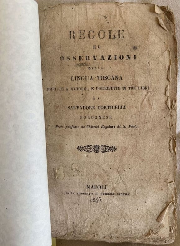 Edizione del 1845 di questa apprezzata e famosa grammatica della lingua italiana, ritenuta una delle prime redatte con sistematività. Corticelli (1690-1758) fu sacerdote barnabita, teologo e linguista che grazie a questo scritto riuscì ad entrare nell'Accademia della Crusca. Tra gli argomenti trattati: delle parti della lingua toscana, della costruzione toscana, della maniera di pronunziare e di scrivere toscano. La prima edizione dell'opera è del 1745, ma la stessa si diffuse nelle scuole a partire dalla metà del '700 sino alla metà avanzata del 1800. In discrete condizioni. In barbe. Copertina morbida moderna in ottime condizioni generali. Legatura in buone condizioni. All'interno le pagine si presentano in discrete condizioni con fioriture e usure. In 8. cm 20,5x13. Pp. VIII+340.Edition of 1845 of this appreciated and famous grammar of italian language, considered as one of the first redacted with sistemativity. Corticelli (1690-1758) was a bernabite priest, teologist and liguistic thanks to this writing managed to enter the Academy of Crusca. Among the issues treated: parts of tuscan language, about the tuscan construction, the manner to pronounce and writing Tuscany. The first edition of the work is of 1745, but this one developed in schools from the second half of 1700 until the second half of 1800. In good conditions. Uncut copy. Modern decorated cover in very good general conditions. Binding in good conditions. Inside pages are in fair conditions with foxing and wearings. In 8. cm 20,5x13. Pp. VIII+340.