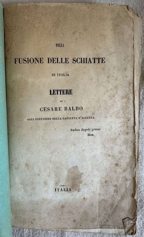 Prima edizione del novembre 1844 di questa opera minore del personaggio risorgimentale Cesare Balbo (1789-1853) "Non è esatta l?indicazione del Ricotti circa la falsa data ITALIA e tanto meno è giusta la citazione del Vismara, Italia 1845. La censura vide adombrata, nello scritto, la questione dell?indipendenza italiana e accordò l?autorizzazione alla stampa con l?indicazione di Italia. Edizione originale, rarissima" (Cfr. Parenti, Rarità IV, 56). "Opera di Cesare Balbo probabilmente stampata in Svizzera. Questa edizione certamente prima, non è registrata dal Vismara, che ha invece un'altra con la stessa data Italia, ma con l'anno 1845" (Cfr. Parenti p. 223). All'interno: Delle schiatte italiche fino alla caduta dell'Imperio Romano (condizioni delle genti antiche, immigrazioni di esse in Europa, Distruzione dell'Imperio ec..), Delle schiatte italiane da quell'epoca fino al presente (teorie e teoremi storici, usi particolari delle genti Germaniche, Genti d'Odoacre, Goti, Longobardi, i Franchi e i tedeschi dei secoli XI, XII, XIII, XIV, XV, Spagnuoli tedeschi, francesi, Nuovafusione delle invasioni governative ec.. In discrete condizioni. Copertina morbida coeva in discrete condizioni con lievi usure marginali. Legatura in discrete condizioni con rotture. Pagine in buone condizioni generali con fioriture. In 16. Dim. 18,5x11,5 cm. Pp. 74.First edition of november 1844 of this minor work by the carachter of Risorgimento period Cesare Balbo (1789-1853) "Non è esatta l?indicazione del Ricotti circa la falsa data ITALIA e tanto meno è giusta la citazione del Vismara, Italia 1845. La censura vide adombrata, nello scritto, la questione dell?indipendenza italiana e accordò l?autorizzazione alla stampa con l?indicazione di Italia. Edizione originale, rarissima" (Cfr. Parenti, Rarità IV, 56). "Opera di Cesare Balbo probabilmente stampata in Svizzera. Questa edizione certamente prima, non è registrata dal Vismara, che ha invece un'altra con la stessa data Italia, ma con l'anno 1845" (Cfr. Parenti p. 223). In fair conditions Soft coeval cover in fair conditions lightly worn in the extremities. Binding in fair general conditions with cracks. Inside pages are in good conditions with foxing. In 16. Dim. 18,5x11,5 cm. Pp. 74.<BR><BR>