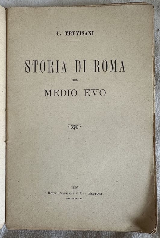 Interessante studio del 1895 su Roma nel Medioevo scritto da Trevisani. All'interno: Roma al tempo dei Goti e dei Longobardi, Roma e i Carolingi, L'età di ferro del papato, Lotta tra il papato e l'Impero, Trionfo del papato dell'impero e sua decadenza, La cattività d'Avignone, I Papi Re ec.. In mediocri condizioni Copertina editoriale in mediocri condizioni con usure e mancanze marginali. Piatto anteriore mancante. Legatura quasi assente. Pagine in buone condizioni generali con rare fioriture. In 8. Dim. 19,5x12,5 cm. Pp. XX+389+(3).Interesting study of1895 about Rome in Middleage written by Trevisani. In poor conditions. Editorial cover in poor conditions lightly worn with wearings in the extremities. Front plate lacks. Binding almost lacks. Inside pages are in good conditions with occasional foxing. In 8. Dim. 19,5x12,5 cm. Pp. XX+389+(3).<BR><BR>