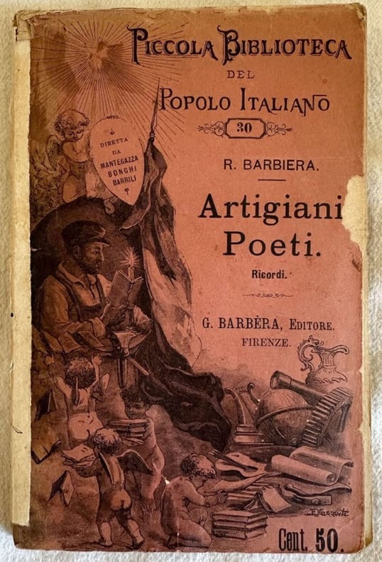 Interessante pubblicazione del 1887 una serie di curiosità e aneddoti su alcune figure interessanti che svolsero il mestiere di artigiano o poeta a cura di Raffaello Barbiera della collana "Piccola Biblioteca del Popolo italiano". Dall'indice: una scorsa nel medioevo; un barbiere sonettista, L'autore del Bertoldo; I bosini milanesi; un gondoliero veneziano del 1700; Un cavapietre siciliano; Il sarto Gianni imrpovvisatore; Il ciabattino dell'Adige; Domenico Stromei; Il parrucchiere del Mincio e il barbiere del Po; A Parma e a Genova; Tre tipografi, un sellaio, Un custode di sala antomica ed altri ancora; Gli ultimi cantastorie e gli ultimi improvvisatori; Carmine Papa zappatore; Giuseppe Rizzotto; Il gondoliere dantofilo; Al di la delle Alpi - i tre maggiori fra gli artigiani poeti; Segue: Inghilterra, Germania, Francia, Svizzera, Serbia, America ec.. Insieme al volume un ritaglio di giornale su Giuseppe Regaldi. In discrete condizioni. Copertina morbida con titolo manoscritto al dorso in discrete condizioni generali con lievi usure ai margini e dorso. Legatura quasi assente. All'interno le pagine si presentano in buone condizioni con rare fioriture. In 16. cm 17x11,5. Pp. 111+(5)Interesting pamphlet of 1887 a series of curiosites and anecdotes about some itneresting figures which made the job of artesan and poet by Raffaello Barbiera of the series "Piccola Biblioteca del Popolo italiano". From the index: una scorsa nel medioevo; un barbiere sonettista, L'autore del Bertoldo; I bosini milanesi; un gondoliero veneziano del 1700; Un cavapietre siciliano; Il sarto Gianni imrpovvisatore; Il ciabattino dell'Adige; Domenico Stromei; Il parrucchiere del Mincio e il barbiere del Po; A Parma e a Genova; Tre tipografi, un sellaio, Un custode di sala antomica ed altri ancora; Gli ultimi cantastorie e gli ultimi improvvisatori; Carmine Papa zappatore; Giuseppe Rizzotto; Il gondoliere dantofilo; Al di la delle Alpi - i tre maggiori fra gli artigiani poeti; Segue: Inghilterra, Germania, Francia, Svizzera, Serbia, America ec.. Together with the volume a cutting of magazine about Giuseppe Regaldi. In fair conditions. Soft cover with handwritten title in the spine in fair general conditions lightly worn in the extremities. Binding almost missing. Inside pages are in good conditions with occasional foxings. In 16. cm 17x11,5. Pp. 111+(5)