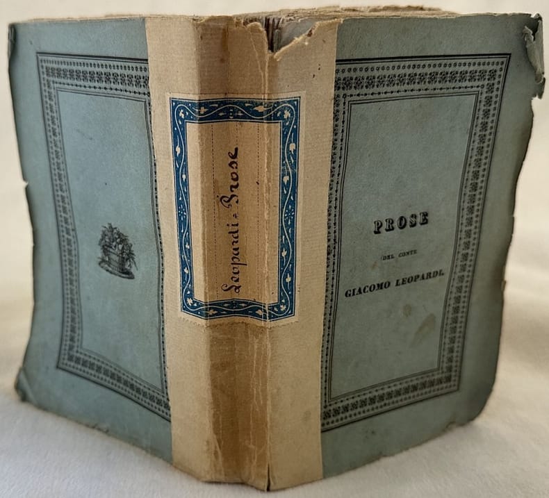 Rarissima seconda edizione del 1834 di questa raccolta di operette morali di Giacomo Leopardi (1798-1837). Leopardi dopo un breve periodo passato a Roma tornò a Recanati dove compose, tra il gennaio e il novembre del 1824 buona parte dell'opera. A seguito del completo esaurimento della prima edizione Stella del 1827 seguì questa seconda edizione del 1834 come indicato nella nota dell'editore ai lettori: "Ondè che per sodisfare alle inchieste che ne venivano fatte, credei gratificarmi ai cultori de buoni studi, riproducendola sulledizione milanese del 1827, la quale è stata riveduta e ritocca dallautore, ed accresciuta di alcune note e dei due ultimi dialoghi". Nonostante la travagliata vicenda editoriale della prima, Leopardi si rivolse comunque al Piatti e anche questa volta non senza problemi. Il manoscritto venne consegnato tra il luglio e l'agosto del 1833, ma a causa della lentezza di Piatti, la stampa si concluse solo nel giugno del 1834. E ulteriori conflitti nacquero per il compenso assegnato allautore: Piatti voleva infatti pagare a copie e non a denari, rischiando così di compromettere le già precarie condizioni economiche di Leopardi. Laccordo, infine, si fece, e il volume uscì con il titolo «Prose» sul cartonato. Edizione originale per i due dialoghi aggiunti e per l'importanza delle note e correzioni. Tanto per cirtarne alcuna: la nota interpretativa a p. 26, segnata *, alla fine della «Storia del genere umano»: fu infatti imposta dalla censura fiorentina e non comparirà più nelle edizioni successive; allo stesso modo, fu sempre il censore Mauro Bernardini a imporre la lezione «di un viver di molti anni» contro loriginale «di un avvenire lontano» (p. 279, r. 20). . Parenti Prime edizioni, pag. 308; Benedettucci 37; Mazzantini-Meneghini vol. 1 p. 136 n. 674. Mazzatinti e Menghini, n. 674; Catalogo del fondo leopardiano, n. 101; Besomi, Operette ed. critica (1979), pp. LI-LII e LXXII-LXXIII. In barbe. In buone condizioni. Copertina editoriale con dorso rinforzato ed etichetta manoscritta al dorso in buone condizioni generali con lievi usure ai margini e dorso. Legatura in buone condizioni con qualche lieve rottura. All'interno le pagine si presentano in buone condizioni con rare fioriture. In 16. cm 15,5x10,5. Pp. 290+(2)Very scarce second edition of 1834 of this collection of moral works by Giacomo Leopardi (1798-1837). Leopardi after a brief period in Rome came back to Recanati where he wrote between january and november 1824 greatest part of the work. As stated byt he editor note to readers this second edition was published because the first edition was unfoundable "Ondè che per sodisfare alle inchieste che ne venivano fatte, credei gratificarmi ai cultori de buoni studi, riproducendola sulledizione milanese del 1827, la quale è stata riveduta e ritocca dallautore, ed accresciuta di alcune note e dei due ultimi dialoghi". Leopardi, despite of the different problems with editor Piatti for the first edition, decided to contact Piatti for this second edition. He gave the manuscripts between july and august 1833 but due to slowlyness of Piatti, they were published only in june 1834. Other problems came for the payment of the copies. They finally agreed and the volume was published with the title «Prose» ine ditorial paper. original edition for the twoo dialogues and for the notes: the notew in p. 26, segnata *, alla fine della «Storia del genere umano»: fu infatti imposta dalla censura fiorentina e non comparirà più nelle edizioni successive; allo stesso modo, fu sempre il censore Mauro Bernardini a imporre la lezione «di un viver di molti anni» contro loriginale «di un avvenire lontano» (p. 279, r. 20). . Parenti Prime edizioni, pag. 308; Benedettucci 37; Mazzantini-Meneghini vol. 1 p. 136 n. 674. Mazzatinti e Menghini, n. 674; Catalogo del fondo leopardiano, n. 101; Besomi, Operette ed. critica (1979), pp. LI-LII e LXXII-LXXIII. Uncut copy. In good conditions. Editorial cover with reinforced spine and handwritten title in the spine in good general conditions lightly worn in the extremities. Binding in good conditions. Inside pages are in good conditions with occasional foxing. In 16. cm 15,5x10,5. Pp. 290+(2)