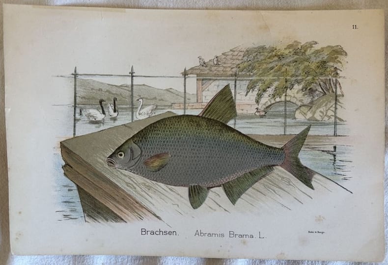 Cromolitografia di inizio novecento che rappresenta un'abramide nel suo ambiente naturale.<BR>In buone condizioni, fioriture. AUTORE: Adolf Hofer (1869-1927) TECNICA: acquaforte DIMENSIONI FOGLIO: cm 17x25,5 DIMENSIONI INCISIONE: cm 13x20 EPOCA: inizio novecentoChromolithography of early 20th century, a common bream in its natural environment In good conditions, foxing. AUTHOR: Adolf Hofer (1869-1927) Date: early 20th century Technique: etching Size of the page:cm 17x25,5 Size of the engraving: cm 13x20 Conditions: Good conditions. Some foxing