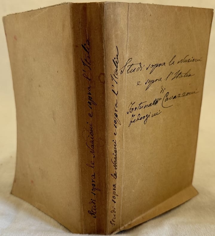 Edizione del 1862 di questo studio socio politico sull'Italia scritto da Fortunato Cavazzoni Pederzini (1799-1864) letterato, storico e patriota modenese. All'interno: Delle diverse nazionalità in generale e della fisiologica in particolare, Dell'origine primitiva delle lingue natura loro e dialetti, Delle lingue come distintivo di nazionalità, Della nazionalità geografica, Nazionalità politica; Della libertà politica civile e amore della patria; Moralità delle nazioni; varietà delle Nazioni; Nazionalità fisiologica in Italia; Nazionalità linguistica in Italia; Di alcuni fatti notabili nella storia della lingua adottiva dell'Italia; S'espone e censurarsi la dottrina del Perrticari in ordine alla comune lingua degl'italiani ec.. In discrete condizioni. Copertina editoriale con titolo manoscritto al dorso e piatto anteriore in buone condizioni generali con lievi usure ai margini e dorso. Legatura in mediocri condizioni con rotture. All'interno le pagine si presentano in buone condizioni con rare fioriture. Occhietto mancante.In 8. cm 19x11,5. Pp. 484.Edition of 1862 of this social political study about Italy written by Fortunato Cavazzoni Pederzini (1799-1864) letterate historian and patriot from Modena. In fair conditions. Editorial cover with handwritten title in the spine and front plate in good general conditions lightly worn in the extremities. Binding in poor conditions with cracks. Inside pages are in good conditions with occasional foxing. First title page lacks. In 8. cm 19x11,5. Pp. 484.