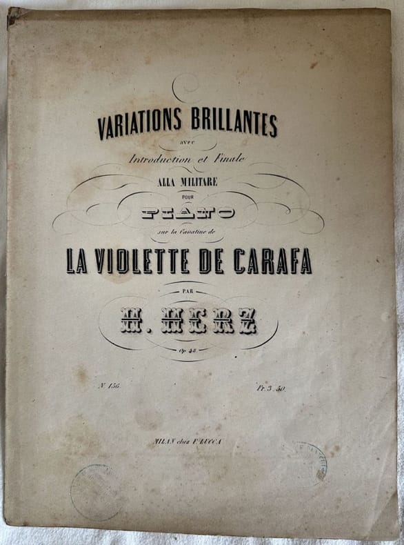 Edizione del 1870 circa della melodia "Variations brillantes avec introduction et finale alla Militare" dall'opera 43 del compositore austriaco Henri Herz (1803-1888). In buone condizioni. Copertina editoriale in buone condizioni con lievi usure marginali. Legatura in ottime condizioni. Pagine in ottime condizioni con rare fioriture. In folio. cm. 35,5x26. Pp. 17.Edition of 1870 circa of the melody "Variations brillantes avec introduction et finale alla Militare" from the opera 43 by the austrian composer Henri Herz (1803-1888).. In good conditions Editorial cover in good conditions lightly worn in the extremities. Binding in very good conditions. Pages in very good conditions with occasional foxing. In folio. cm. 35,5x26. Pp. 17.