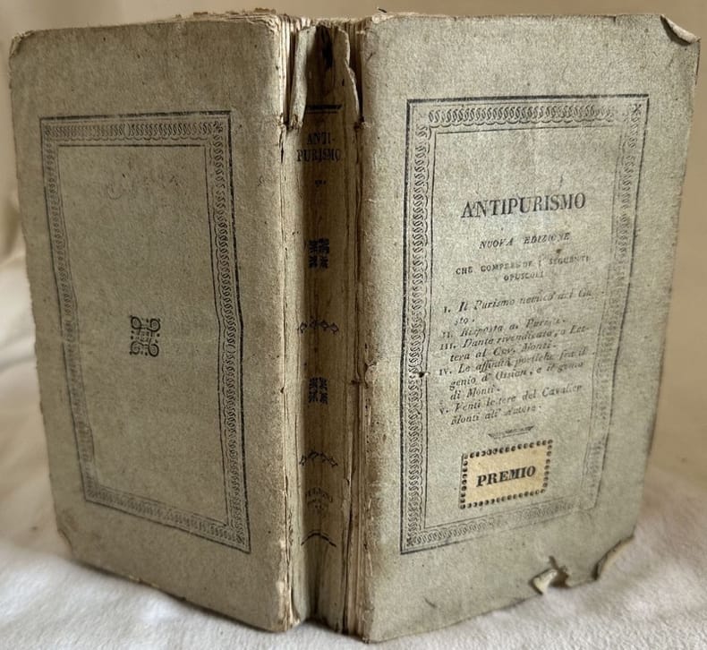Edizione originale del 1829 di questo interessante saggio di critica scritti dal critico letterario italiana Francesco Torti di Bevagna (1763-1842). L'opera è una raccolta di cinque trattarelli di polemica "antipurista" a favore del Monti. Torti divenne famoso per essere stato additato di eresia da Monaldo Leopardi grazie alla sua opera La corrispondenza di Monteverde, che gli valse la messa all'Indice. Insieme all'opera un libretto di sette pagine ottocentesco manoscritto con alcuni appunti di letteratura. Tra gli argomenti descritti: le novelle del Boccaccio, Claudio Tolomei, Tiraboschi, Girolamo Muzio ec.. In buone condizioni. Copertina editoriale in buone condizioni con lievi usure ai margini e dorso. Legatura in buone condizioni. All'interno le pagine si presentano in buone condizioni con fioriture. In 8. 19x11 cm. Pp. 506+(4)Original edition of 1829 of this interesting essay of critics written by the literary critic of italian literature Francesco Torti from Bevagna (1763-1842). The work is a collection of five little treaties of "antipuirist" polemics in favour of Monti. Torti was famous because he was considered heretics by Monaldo Leopardi thanks to his work La corrispondenza di Monteverde, taht was put in the index. Together with the work a booklet of seven handwritten page of 19th century with some notes of literature. between the issues treated: le novelle del Boccaccio, Claudio Tolomei, Tiraboschi, Girolamo Muzio ec.. In good conditions. Editorial cover in good conditions lightly worn in the extremities. Binding in good conditions. Inside pages are in good conditions with foxing. In 16. 16x11 cm. Pp. 91+(3)