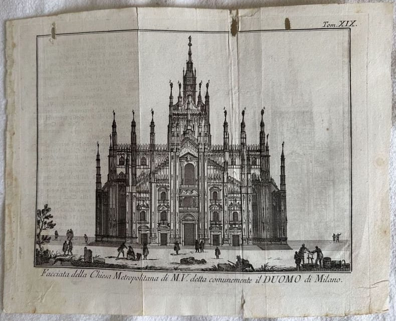Veduta del Duomo di Milano. Atlante: Lo stato presente di tutti i popoli del mondo 1737-50 Data: 1750 circa Tecnica: incisione su rame Dimensione del foglio: 19x24 cm Dimensione incisione: 15x19,5 cm Condizioni: Buone. Alcune fioriture e lievi gore Alcuni fori.View of the Dome of Milan. Atlas: Lo stato presente di tutti i popoli del mondo 1737-50 Date: 1750 circa Technique: Copper etching Leaf Dimension:19x24 cm Engraving Dimension: 15x19,5 cm Conditions: Good conditions. Some foxing.