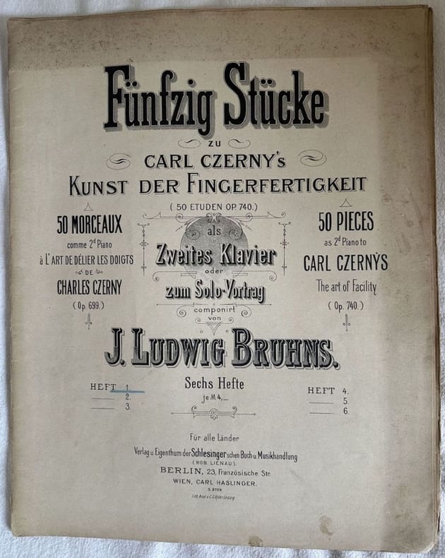 Edizione della fine dell'ottocento di otto melodie dall'opera 740 del compositore di pianoforte Ludwig Bruhms dalla collana "50 studi dall'opera 740". In buone condizioni. Copertina editoriale in buone condizioni con lievi usure marginali. Legatura editorialmente assente. Pagine in buone condizioni con fioriture. In folio. cm. 34x27. Pp. 30.Edition of late 19th century of the melody from the opera 740 by the piano composer Ludwig Bruhms from the series "50 studi dall'opera 740". In good conditions. Editorial cover in good conditions lightly worn in the extremities. Binding editoriarly lacks. Pages in good conditions with foxing. In folio. cm. 34x27. Pp. 30.