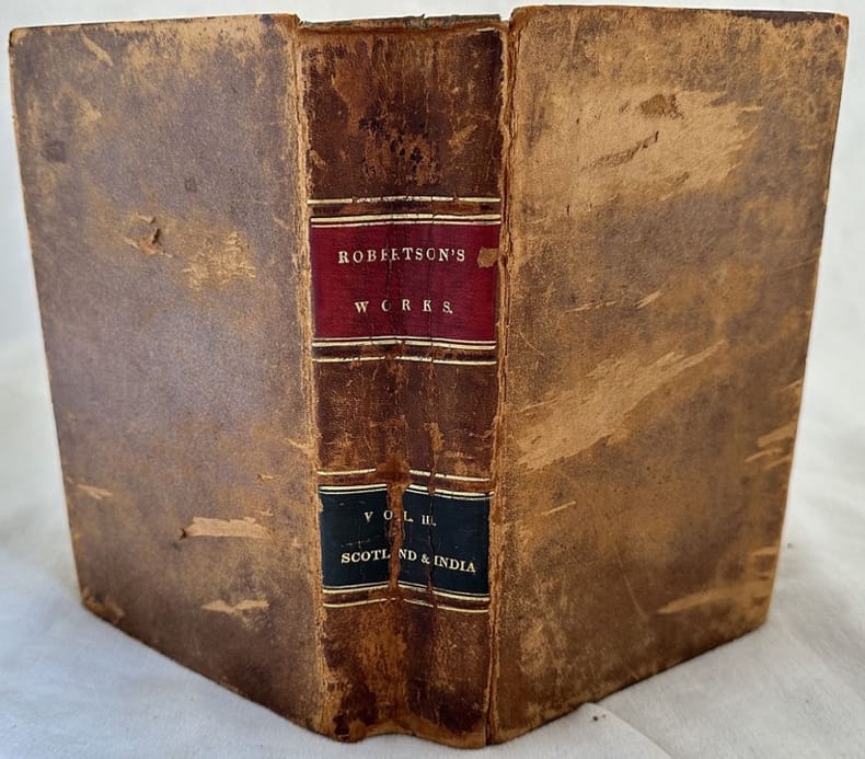 Raccolta di due opere dello storico scozzese William Robertson (1721-1793). La prima opera è l'edizione del 1831 della storia di Scozia dal Re Giacomo VI fino all'annessione alla Corona di inghilterra. Alla fine alcune appendici tra cui una dissertazione cirtica sull'omicidio del Re Enrico. Segue l'edizione del 1831 di una disquisizione storica sulla conoscenza degli antichi dell'India e i suoi progressi commerciali. Alla fine appendice sugli aspetti civili, politici, giuridici, arti, scienze, istituzioni religiose degli indiani. Testo in lingua inglese. Due mappe ripiegate: Parte meridionale dell'Asia secondo Tolomeo e parte sud orientale dell'Asia. Veduta di Elephanta e ritratto della Regina Maria di Scozia. In buone condizioni. Copertina in piena pelle coeva con titolo in oro al dorso in buone condizioni generali con lievi usure ai margini e dorso. Legatura in buone condizioni. All'interno le pagine si presentano in buone condizioni con fioriture e bruniture. In 8. cm. 22,5x14. Pp. 460+146+(2). Collection of two works by the scottish historian William Robertson (1721-1793). The first one is the edition of 1831 of the history of Scotland from King Henry VI to the inclsuion to the crown of England. At the end some appendix as the murder of King Henry. then the edition of 1831 of an historical disquisition about the knwoldgement of antiques about India and its commercial progresses. At the end appendix about civil, politician, juridical, arts, science, religious institutions of indians. Text in english language. Two fodled maps: Souther part of Asia according to Ptolemy and south east part of Asia. In good conditions. Leather cover with gilted title in the spine in good general conditions lightly worn in the extremities. Binding in good conditions. Inside pages are in good conditions with foxing and yellowings.In 8. cm. 22,5x14. Pp. 460+146+(2).<BR><BR>