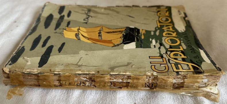 Edizione del 1932 di questo volume sugli esploratori scritto da Arnaldo Faustini. All'interno: Sir John Franklin, David Livingstone, H. M. Stanley, Giacomo Bove, Fridtjof Nansen, Guido Boggiani, Vittorio Bottego, A. S. Andree, A. de Gerlache, Alberto I di Monaco, E. H. Shackleton, Sven Hedin, Luigi Amedeo di Savoia, Robert E. Peary, Roald Amundsen, Robert F. Scott ec.. All'interno numerose foto e mappe nel testo. Copertina illustrata da Brugo. In mediocri condizioni. Copertina editoriale in mediocri condizioni con usure e mancanze marginali. Dorso riparato da nastro adesivo. Legatura quasi assente. Pagine in buone condizioni generali con fioriture. In 8. Dim. 23,5x16,5 cm. Pp. XI+299+(3).Edition of 1932 of this volume about explorers written by Arnaldo Faustini. Inside: Sir John Franklin, David Livingstone, H. M. Stanley, Giacomo Bove, Fridtjof Nansen, Guido Boggiani, Vittorio Bottego, A. S. Andree, A. de Gerlache, Alberto I di Monaco, E. H. Shackleton, Sven Hedin, Luigi Amedeo di Savoia, Robert E. Peary, Roald Amundsen, Robert F. Scott ec.. Inside different photoes and maps in the text. Cover illustrated by Brugo. In poor conditions. Editorial cover in poor conditions lightly worn with wearings in the extremities. Spine repaired with adhesive tape. Binding almost lacks. Inside pages are in good conditions with foxing. In 8. Dim. 23,5x16,5 cm. Pp. XI+299+(3).<BR><BR>