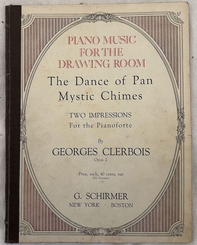 Edizione del 1918 dell'opera 2 "The Dance of Pan Mystic chimes" di pianoforte del compositore Georges Clerbois. Nel volume sono presenti nove melodie ed è completo: Mystic Chimes, The Dance of Pan, L'oiseau d'Orage, Serenade Fantasque, Minuetto, Berceuse Naive, Sur l'eau Over the waters, Danse Rustique, Danse Orientale. Decorazioni in copertina. In buone condizioni. Copertina editoriale in buone condizioni con lievi usure marginali. Legatura in buone condizioni. Pagine in ottime condizioni con rare fioriture. In Folio. cm. 30,5x23. Pp. 7, 7, 3, 7, 5, 5, 7, 7, 9.Edition of 1918 of the opera 2 "The Dance of Pan Mystic chimes" of piano by the composer Georges Clerbois. In the volume gthere are nine melodiesMystic Chimes, The Dance of Pan, L'oiseau d'Orage, Serenade Fantasque, Minuetto, Berceuse Naive, Sur l'eau Over the waters, Danse Rustique, Danse Orientale. Decorations in the cover. In good conditions. Editorial cover in good conditions lightly worn in the extremities. Binding in good conditions. Pages in very good conditions with occasional foxing. In Folio. cm. 30,5x23. Pp. 7, 7, 3, 7, 5, 5, 7, 7, 9.