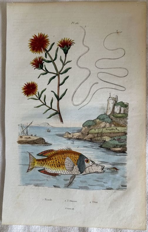 Incisione del 1839 colorata a mano che mostra un pesce, la pianta Uvularia sessilifolia e il parassita della Filaria. Data: 1839 Autore: E. Guerin Tecnica: xilografia acquarellata a mano Dimensione del foglio: 180x290 mm Dimensione incisione: 140x210 mm Condizioni: Buone. Alcune fioriture. Nice woodcut of 1839 coloured by hand representing a fish and the plant Uvularia sessilifolia and a parasite of Filaria. Date: 1839 Author E. Guerin Technique: xilography painted by hand Size of the page: 180x290 mm Size of the engraving: 140x210 mm Conditions: Good conditions. Some foxing