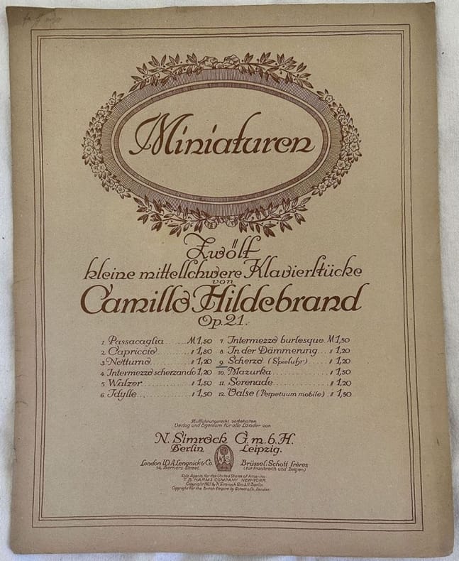 Edizione del 1921 della melodia per pianoforte "Scherzo" dall'opera 21 di Camillo Hildebrand (1872-1953). In discrete condizioni. Copertina editoriale in buone condizioni con lievi usure marginali. Legatura in buone condizioni. Pagine in buone condizioni con rare fioriture. In Folio. cm. 34x27. Pp. 3Edition of 1921 circa of the melody for piano "Scherzo" from the opera 21 by Camillo Hildebrand (1872-1953). In fair conditions. Editorial cover in good conditions lightly worn in the extremities. Binding in good conditions. Pages in good conditions with occasional foxing. In Folio. cm. 34x27. Pp. 3