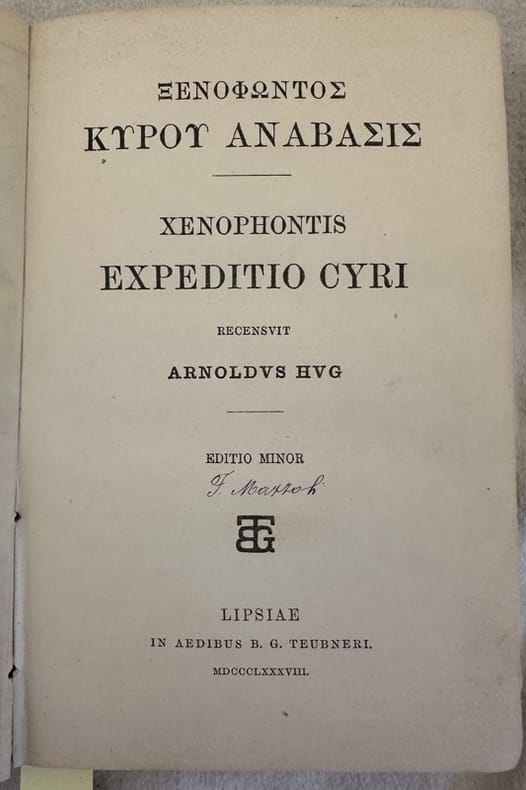 Edizione del 1888 del famoso testo di Senofonte, la "Spedizione di Ciro".<BR>In questa suo celebre scritto il grande scrittore greco narra il viaggio dell'armata dei Diecimila verso il Mar Nero dopo la battaglia di Cunassa. Testo in greco con sunto a cura di Arnold Hug (1832-1895).<BR>Firma al frontespizio e alla pagina di sguardia. Mappa a doppia pagina in antiporta. In buone condizioni. Copertina in mezza pergamena con titolo manoscritto al dorso in discrete condizioni generali con usure ai margini e mancanze al dorso. Legatura in buone condizioni. All'interno le pagine si presentano in buone condizioni con rare fioriture. In 16. Dim. 18x12 cm. Pp. X+260.Edition of 1888 of the famous text of Xenophon, Spedizione di Ciro. In this famous writing he talks about the voyage of the Army of Ten thousands towards the Black Sea, after the battle of Cunassa. Text in greek language with resuming by Arnold Hug (1832-1895).<BR>Signature in the title page and in the first endpage. Map in double page. In good conditions. half parchment cover with handwritten title in the spine in fair general conditions lightly worn in the extremities and lackings in the spine. Binding in good conditions. Inside pages are in good conditions with occasional foxing. In 16. Dim. 18x12 cm. Pp. X+260.