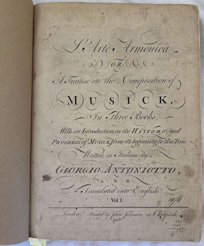 Rarissima prima edizione del 1760 di questo manuale sulla produzione della musica a cura del compositore e teorico Giorgio Antoniotto (1692-1776). Noto violinista e violloncellista ebbe modo di frequentare diverse Corti europee come Vienna, Parigi, Madrid e Lisbona. Durante la sua permanenza in Inghilterra pubblicò "L'arte armonica" scritto in italiano ma tradotto e pubblicato in inglese. La prefazione di questo volume venne tradotta da Samuel Pegge. In questo manuale Antoniotto propone un sistema di composizione utilizzando come basso fermo il primo e quinto grado della scala nella tonalità del pezzo, che si pone come guida della melodia. L'opera è composta da due volumi ed è completa. Il primo tomo è sulla teoria, il secondo tomo sono 62 tavole (una delle quali ripiegata) con schemi e partiture musicali. In ottime condizioni. Copertina in mezza pelle moderna con titolo in oro al dorso in ottime condizioni generali con lievi usure ai margini e dorso. Legatura in ottime condizioni. All'interno le pagine si presentano in buone condizioni con fioriture. In folio. Dim. 32,5x23,5 cm. Pp. (10)+109+(1)+62 pl..Very scarce first edition of 1760 of this manual about the production of music by the composer and theorian Giorgio Antoniotto (1692-1776). Famous violin and violoncello player he frequented different european Courts as Vienna, Parigi, Madrid e Lisbona. During his permanence in England he published "L'arte armonica" written in italian but translated and published in english. The prefation of this volume was translated by Samuel Pegge. In this manuale Antoniotto proposes a compositional system using as immovable bass the first and fifth scale degrees in the tonality of the piece, which he terms principal and guide. Related to this immovable foundation, he generates a fundamental counterpoint for harmonic progression and as a foundation for the fundamental harmony which gives rise to the chordal structures and melodic contours of the music. The work is made up of two volumes bound together and it is complete. The first tome is about theory, the second tome contains 62 plates (one of them is folded) with schemes and scores. In very good conditions. Half leather modern cover with gilted title in the spine in very good general conditions lightly worn in the extremities. Stains. Binding in very good conditions. Inside pages are in good conditions with foxing. In folio. Dim. 32,5x23,5 cm. Pp. (10)+109+(1)+62 pl..<BR><BR>