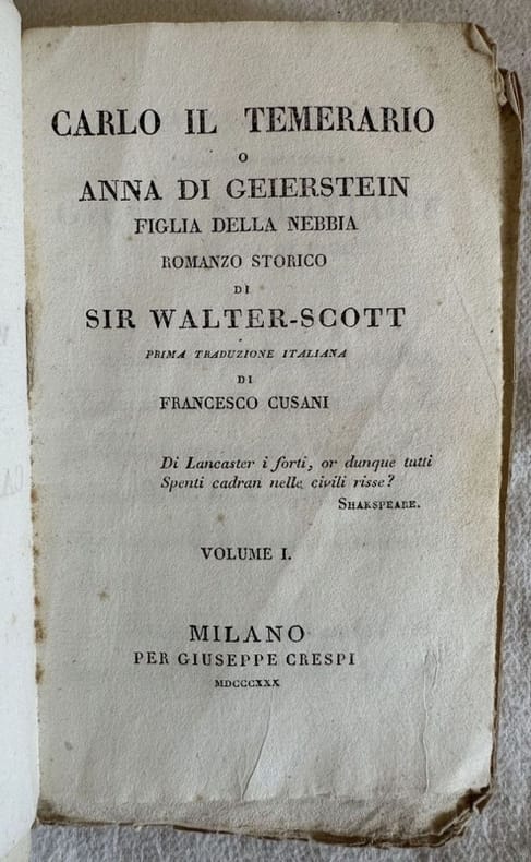 Prima edizione italiana del 1830 di questo romanzo di Walter Scott (1771-1832) poeta e scrittore scozzese nato ad Edimburgo e morto ad Abbotsford. Traduzione a cura di Francesco Cusani. L'opera era composta da tre volumi, siamo in possesso solo del primo tomo.<BR>In buone condizioni. Copertina decorata moderna in ottime condizioni generali. Legatura in buone condizioni. All'interno le pagine si presentano in buone condizioni con fioriture. In barbe. In 16. Dim. 14,5x9 cm. Pp. 260. First italian edition of 1830 of the famous novel by Walter Scott (1771-1832) scottish poet and writer born in Edimburgh and dead in Abbotsford. Translation by Francesco Cusani. The work was made up of three volumes, we only have the first tome.<BR>In good conditions. Editorial modern cover in very goos general conditions. Binding in good conditions. Inside pages are in good conditions with foxing. uncut copy. In 16. Dim. 14,5x9 cm. Pp. 260.
