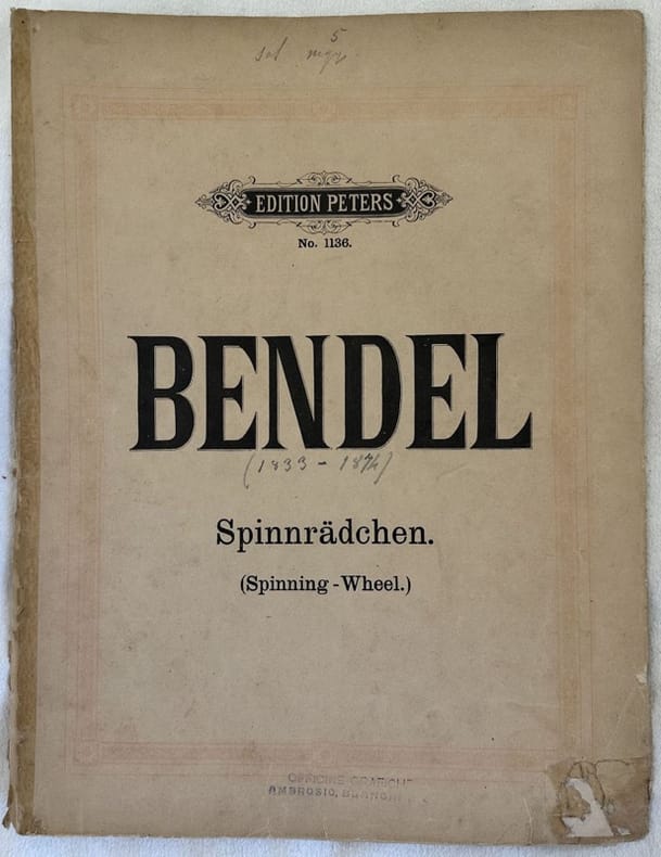 Edizione della fine dell'ottocento della melodia "In Senta's Spinnstube" di Franz Bendel (1833-1874). In discrete condizioni. Copertina editoriale in discrete condizioni con lievi usure marginali. Legatura in discrete condizioni con rotture. Pagine in buone condizioni con rare fioriture. Dorso coperto da carta In Folio. cm. 31x24. Pp. 9.Edition of late 19th century of the melodies "In Senta's Spinnstube" Franz Bendel (1833-1874). In fair conditions. Editorial cover in fair conditions lightly worn in the extremities. Binding in fair conditions with cracks Pages in good conditions with occasional foxing. Spine covered by paper. In Folio. cm. 31x24. Pp. 9.