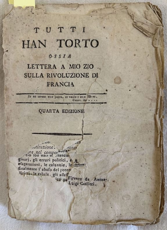 Edizione del 1793 di questa nota opera del modicano Saverio Scrofani (1756-1835). Scrofani fece studi di economia, agraria e letteratura prima a Firenze poi in Francia. Fu sovrintendente all'agricoltura della Repubblica veneta e direttore della Statistica a Napoli. "Opera di Saverio Scrofani stampata a Firenze da Antonio Giuseppe Pagani" cfr. Parenti p. 209. L'opera, pubblicata per la prima volta nel 1791 è una critica sia ai repubblicani che ai loro oppositori e non si colloca nella linea dell'ideologia antirivoluzionaria. L'autore analizza le varie fasi della Rivoluzione francese. In mediocri condizioni. Copertina morbida coeva in mediocri condizioni generali con usure ai margini e dorso. Piatto anteriore assente. Legatura quasi assente. Frontespizio staccato. All'interno le pagine si presentano in mediocri condizioni con fioriture. Parte mancante al frontespizio e alla prima carta bianca con perdita di testo. Strappi alle prime tre carte. In 8. cm 19x13,5. Pp. 112. Edition of 1793 of this famous work by Saverio Scrofani (1756-1835). Scrofani studied economy, agriculture and litterature in Florence and France. "Opera di Saverio Scrofani stampata a Firenze da Antonio Giuseppe Pagani" cfr. Parenti p. 209. The work, published for the first time in 1791 is a critic to republicans and opposers and it is not in the line of antirevolutionary ideaology. The author analyzes the different stages of french revolution. In poor conditions. Soft coeval cover in poor conditions lightly worn in the extremities. Front plate lacks. Binding almost missing. Title page lacks. Pages in poor conditions with foxing. Missing part in the title page and in the first white page with loss of text. Tears in the first three pages. In 8. cm 19x13,5. Pp. 112.