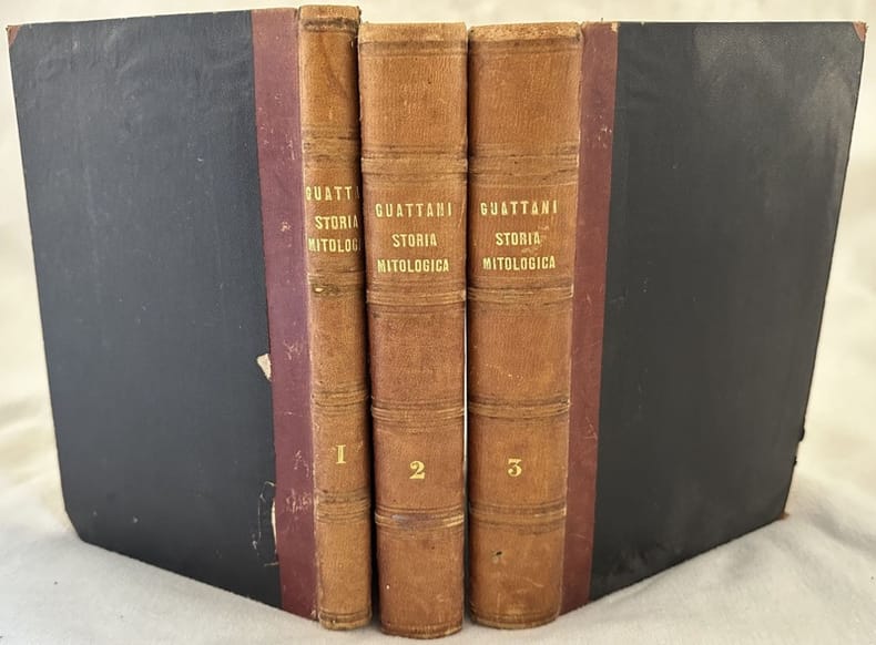 Prima edizione del 1838-39 di questa serie di lezioni di storia mitologia e costumi applicati all'arte del disegno scritta dall'archeologo scrittore e professore di storia e mitologia Giuseppe Antonio Guattani (1748-1830). L'opera è composta da tre volumi ed è completa. Ritratto dell'autore in antiporta coperto da velina. Tra le lezioni presenti: Antica Grecia, Costumi religiosi civili e militari de greci (divinità del cielo, della terra, infernali, allegoriche, degli uomini greci, Usi militari, Storia filosofica, personaggi ec..). In ottime condizioni. Copertina in mezza pelle a quattro nervi con titolo e decorazioni in oro al dorso in buone condizioni generali con lievi usure marginali. Legatura in buone condizioni. All'interno le pagine si presentano in ottime condizioni con rare fioriture. In 8. cm. 23,5x16. Pp. XLV+(1)+216+(1), 511+(1), 542+(1). First edition of 1838-39 of this series of lessons of history mythology and costumes applied to the art of design written by the archeologistwriter and teacher of history and mythology written by Giuseppe Antonio Guattani (1748-1830). The work is made up of three volumes and it is complete. Portrait of the author in the frontspice cvovered by tissue paper. the lessons inside: Ancient Greece, religious civil and military costumes of greek people (Gods of Sky, earth, hell, allegory, greek men, military usages, phylosohic history ec..). In very good conditions. Half leather coeval cover with four nerfs and title and gilted decorations in the spine in good general conditions lightly worn in the extremities. Binding in good conditions and page 1 detached. Inside pages are in very good conditions with occasional foxing. In 8. cm. 23,5x16. Pp. XLV+(1)+216+(1), 511+(1), 542+(1).