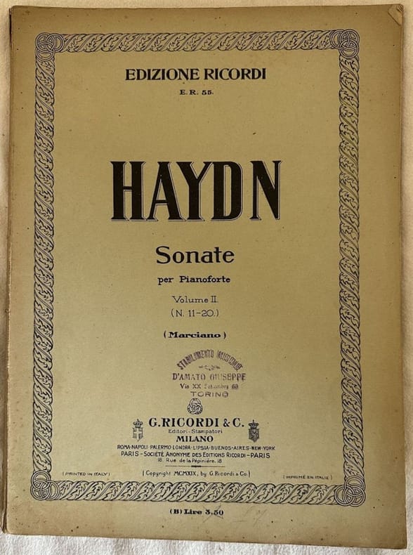 Edizione Ricordi del marzo 1923 di questa raccolta di sonate per pianoforte di Joseph Haydn (1732-1809) compositore austriaco. Siamo in possesso del secondo tomo solamente contenente le sonate dalla 11 alla 20 rivedute da Ernesto Marciano. In buone condizioni. Copertina editoriale in discrete condizioni con lievi usure marginali. Piatto anteriore in parte staccato. Legatura in discrete condizioni. Pagine in buone condizioni con rare fioriture. In Folio. cm. 31,5x23,5. Pp. 97.Ricordi edition of march 1923 of this collection of sonates for piano by the austrian composerJoseph Haydn (1732-1809). We onyl have the second tome containings sonate from 11 to 20 reviewed by Ernesto Marciano. In good conditions Editorial cover in fair conditions lightly worn in the extremities. Front plate partially detached. Binding in fair conditions. Pages in good conditions with occasional foxing. In Folio. cm. 31,5x23,5. Pp. 97.