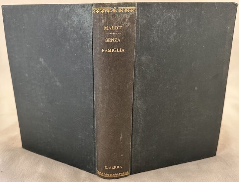 Rara edizione italiana del 1898 del celebre romanzo per ragazzi "Sans famille" di Hector Malot (1830-1907). L'opera venne pubblicata per la prima volta nel 1878 ed ebbe un immediato successo. Narra le avventure del piccolo Remy che parte alla ricerca della sua famiglia. Alcune illustrazioni nel testo di Giuseppe Anichini. L'opera è composta da due tomi legati insieme in un unico volume ed è completa. In buone condizioni. Copertina in tela con titolo e decorazioni in oro al dorso in buone condizioni generali con lievi usure ai margini e dorso. Legatura in buone condizioni. Pagine in ottime condizioni con rare fioriture. In 16. cm 18,5x13,5. Pp. 247+(9)+297+(7).Scarce italian edition of 1898 of the famous novel for children "Sans famille" by Hector Malot (1830-1907). The work was published for the first time in 1878 and had an immediate success. The novel talks about the adventures of Remy who leaves to the research of his family. Some illustrations in the text by Giuseppe Anichini. The work is made up of two tomes bound together in one volume and it is complete. In good conditions. Cloth cover with giltd title and decorations in the spine in good conditions lightly worn in the extremities. Binding in good conditions. Pages in very good conditions with occasional foxing. In 16. cm 18,5x13,5. Pp. 247+(9)+297+(7).