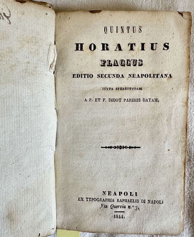 Edizione del 1844 di questa raccolta di opere del poeta romano Quinto Orazio Flacco. All'interno sono presenti le seguenti opere: Carminum, Epodon, Satirarum, Epistolarum, Ars poetica ecc.. Note a cura di Didot. Firma alla prima carta bianca. In buone condizioni. Copertina in piena pergamena coeva con titolo manoscritto al dorso in discrete condizioni generali con lievi usure ai margini e dorso. Legatura in buone condizioni. All'interno le pagine si presentano in ottime condizioni con rare fioriture. Macchie di inchiostro al margine superiore. Alcune lievi gore d'umidità. In 16. cm 16x9,5 cm. pp. 225 Edition of 1844 of this collection of works by the roman poet Quinto Orazio Flacco. Inside there are the following works: Carminum, Epodon, Satirarum, Epistolarum, Ars poetica. Notes by Didot. Signature in the first blank page. In good conditions. Parchment coeval cover with handwritten title in the spine in fair general conditions lightly worn in the edges and spine. Binding in good conditions. Inside pages are in very good conditions with occasional foxings. Ink's stains in the upper edge. Some light dump stains. In 16. cm 16x9,5 cm. pp. 225