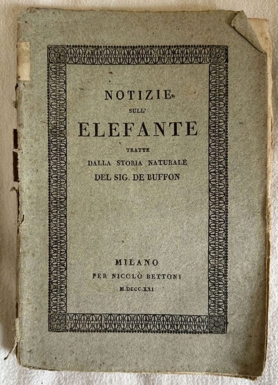 Curiosa opera del 1821 sull'elefante estratto dalla storia naturale del Conte di Buffon. L'opera venne pubblicata a seguito della visita di un esemplare di elefante allo zoo di Milano. In buone condizioni. Copertina editoriale in discrete condizioni generali con usure e mancanze ai margini e dorso. Legatura quasi assente. Pagine in buone condizioni con fioriture. Angolo superiore destro di pag. 57 mancante con lieve perdita di testo. In 16. cm 18,5x12,5. Pp. 59+(1). Curious work of 1821 about the elephanttaken from the extract of natural history of Conte di Buffon. The work was published after the visit of a specimen of an elephant in the zoo of Milan. In good conditions. Editorial cover in fair conditions lightly worn in the extremities. Binding almost lacks. Pages in good conditions with foxing. Upper right corner of pag. 57 missing with some loss of text. In 16. cm 18,5x12,5. Pp. 59+(1).