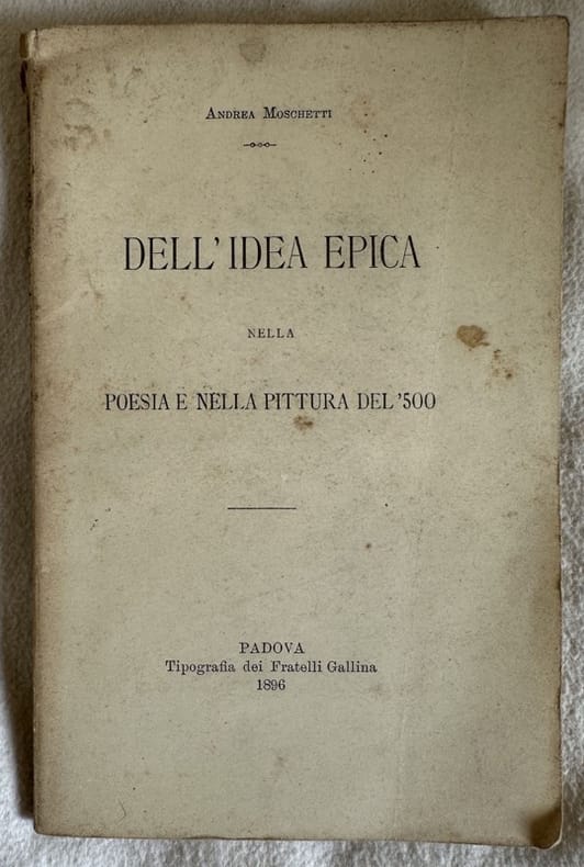 Rara pubblicazione del 1896 sull'idea epica nella poesia e pittura del cinquecento a cura di Andrea Moschetti. Conferenza tenuta all'Accademia di Belle Arti in Urbino per la solenne commemorazione di Raffaello il 28 marzo 1895. In ottime condizioni. Copertina editoriale in buone condizioni generali con lievi usure ai margini e dorso. Legatura in buone condizioni. Pagine in buone condizioni con fioriture. In 16. Dim. 16,5x11 cm. Pp. 78 Scrace pamphlet of 1896 about the epic idea in poetry and painting of 16th century by Andrea Moschetti. Conference held in Accademia di Belle Arti in Urbino for the solemn commemoration of Raffaello the 28th of march 1895. In very good conditions. Editorial cover in good general conditions lightly worn in the extremities. Binding in good conditions. Inside pages are in good conditions with foxing. In 16. Dim. 16,5x11 cm. Pp. 78