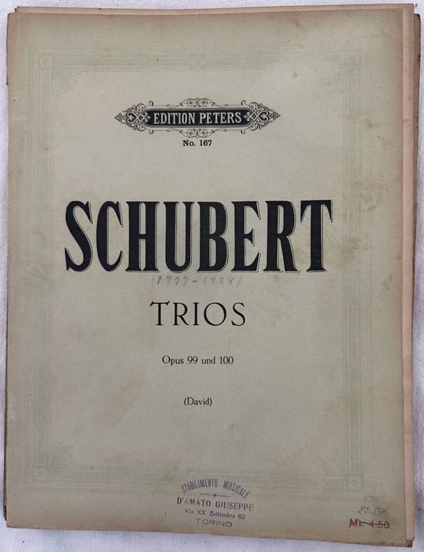 Edizione Leipzig della fine dell'ottocento o inizi novecento della melodia "Trio" dall'opera 99 di Franz Schubert (1797-1828) adattato da Ferd. David. L'opera è composta da quattro fascicoli: pianoforte, violino, violoncello. In buone condizioni. Copertina editoriale in discrete condizioni con lievi usure marginali. Legatura in discrete condizioni con lievi rotture. Pagine in buone condizioni con rare fioriture. In Folio. cm. 30,5x24. Pp. 120, 27, 13, 27.Edizione Leipzig della fine dell'ottocento o inizi novecento della melodia "Trio" dall'opera 99 di Franz Schubert (1797-1828) adattato da Ferd. David. L'opera è composta da quattro fascicoli: pianoforte, violino, violoncello. In buone condizioni. Copertina editoriale in discrete condizioni con lievi usure marginali. Legatura in discrete condizioni con lievi rotture. Pagine in buone condizioni con rare fioriture. In Folio. cm. 30,5x24. Pp. 120, 27, 13, 27.Leipzig edition of lateof 19th cenutry or early 20th century of the melody "Trio" of the opera 99 by Franz Schubert (1797-1828) cared by Ferd. David. The work is made up of four pamphlets: piano, violin, violoncello. In good conditions. Editorial cover in fair conditions lightly worn in the extremities. Binding in fair conditions with light cracks. Pages in good conditions with occasional foxing. In Folio. cm. 30,5x24. Pp. 120, 27, 13, 27.