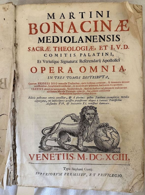 Martini Bonacinæ Mediolanensis sacræ theologiæ et J.U.D. Uticensis episcopi ... Opera omnia : in tres tomos distributa : nedum variis eiusdem auctoris tractatibus, folio, full leather and condition fair, 3 parts in two volumes, v. (lvi, 544+; [8], 474, [2]; [8], 332 p.), [1], bindings in good condition, good copy