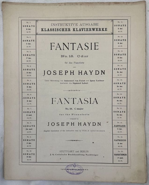 Edizione del 1892 della melodia "Fantasia no 18 in do maggiore" per pianoforte di Joseph Haydn (1732-1809) compositore austriaco rivista da Immanuel von Faisst, Ignaz Lachner e Sigmund Lebert. Traduzione inglese a cura di Percy Goetschius. In discrete condizioni. Copertina editoriale in discrete condizioni con usure marginali. Legatura quasi assente. Pagine in buone condizioni con rare fioriture. In Folio. cm. 34x27. Pp. 10.Edition of 1892 of the melody "Fantasia no 18 in do maggiore" for piano by Joseph Haydn (1732-1809) austrian composer reviewed by Immanuel von Faisst, Ignaz Lachner e Sigmund Lebert. English translation by Percy Goetschius. In fair conditions. Editorial cover in fair conditions lightly worn in the extremities.Binding is missing. Pages in good conditions with occasional foxing. In Folio. cm. 34x27. Pp. 10.