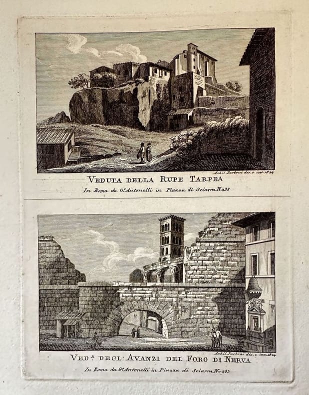 Finissima tavola del 1824, due vedute di Roma incise da Achille Parboni (Roma sec. XVIII-XIX) attivo a Roma, insieme al fratello Pietro, nella prima metà del XIX secolo. La veduta animata mostra la rupe Tarpea e i resti del Foro di Nerva. AUTORE: Achille Parboni ATLANTE: Nuova raccolta delle Principali vedute Antiche e moderne dell'alma città di Roma e sue vicinanze EPOCA: 1824 TECNICA: Incisione a bulino DIMENSIONI FOGLIO: cm 25,5x19 DIMENSIONI INCISIONE: cm 17,5x13 CONDIZIONI: Ottime Very fine plate of 1824, two views of Rome engraved by Achille Parboni (Roma sec. XVIII-XIX) active in Rome, together with his brother Pietro, in the first half of XIX century. The animated view shows rupe Tarpea and parts of Foro di Nerva. AUTHOR: Achille Parboni ATLAS: Nuova raccolta delle Principali vedute Antiche e moderne dell'alma città di ROma e sue vicinanze TECHNIQUE: Burin engraving LEAF DIMENSION: cm 25,5x19 ENGRAVING DIMENSION: cm 17,5x13 DATE: 1824 CONDITIONS: Very good conditions<BR><BR>