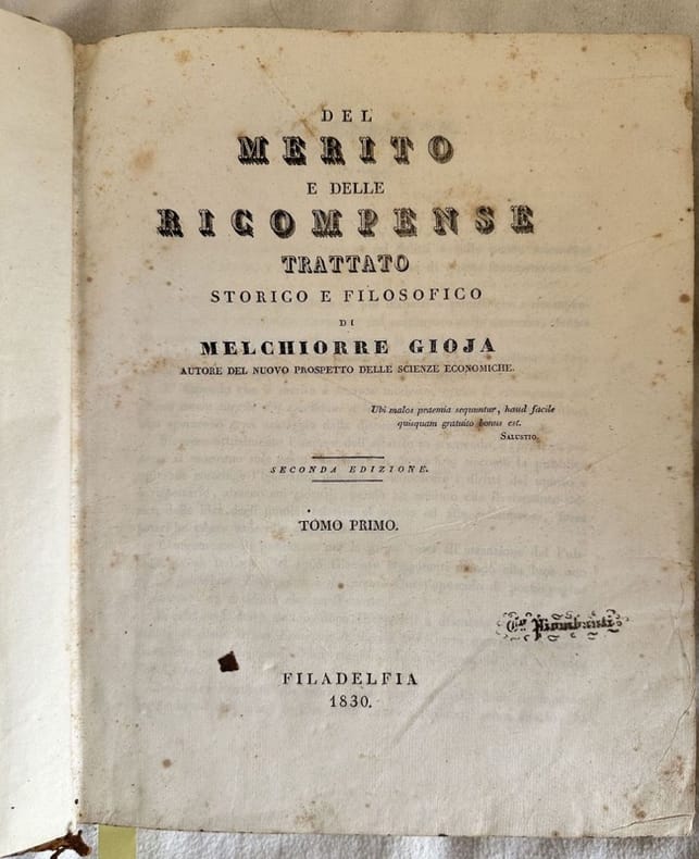 Edizione del 1830 di questo trattato storico e filosofico del celebre economista e storiografo Melchiorre Gioja (Piacenza 1767 - Milano 1829). Gioja prese parte attivamente al movimento risorgimentale italiano. L'opera è composta da due tomi legati insieme in un unico volume ed è completa. Tra gli argomenti trattati: Del merito considerato nelle forze esecutrici (forze fisiche, forze morali, forze intellettuali, Del merito considerato nell'effetto prodotto, Intensità dei servigi, Del merito considerato nel motivo impellente, Sintomi di forze fisiche) Falso merito, Giudici del merito, Delle ricompense ecc. Firma al frontespizio. Tagli marmorizzati. In discrete condizioni. Copertina in mezza pelle ottocentesca in discrete condizioni generali con lievi usure ai margini e dorso. Legatura in buone condizioni. All'interno le pagine si presentano in buone condizioni con fioriture. In 4. Dim. 27,5x22 cm. Pp. (4)+252+324. Peso Kg. 1,300Edition of 1830 of this historic and phylosohpic treaty by the famous economist and history writer Melchiorre Gioja (Piacenza 1767 - Milano 1829).<BR>Gioja took active part to the italian movement of risorgimento. the work is amde up of two tomes bound together and it is complete. Signature in the title page. Marbled external edges of pages. In fair conditions. Half leather cover of XIX century in fair general conditions lightly worn in the edges and spine. Binding in good conditions. Inside pages are in good conditions with foxing. In 4. Dim. 27,5x22 cm. Pp. (4)+252+324. Peso Kg. 1,300