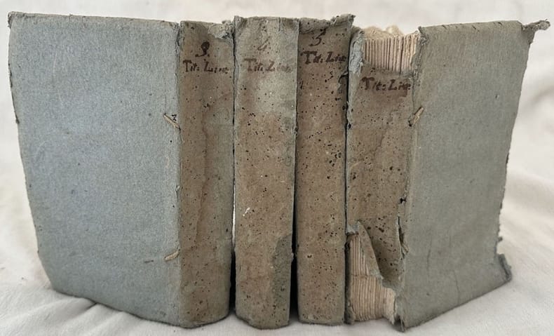 Edizione Remondini del 1821 dell'opera classica "Ab Urbe condita" dello storico romano Tito Livio. Testo latino con note a cura di Jean Baptiste Louis Crevier (1693-1765). Supplemento sugli ultimi libri a cura di Arnold Drakenborch (1684-1748). Aggiunta di frammenti ritrovati nella Biblioteca Vaticana a cura di Vito Maria Giovenazzi (1727-1805). L'opera era composta da sette tomi, siamo in possesso di quattro solamente (tomo terzo, quarto, quinto, settimo). Antica firma al contropiatto. In barbe. In buone condizioni. Copertina cartonata coeva con titolo manoscritto al dorso in buone condizioni generali con lievi usure ai margini e dorso. Qualche rottura al dorso. Legatura in buone condizioni con qualche lieve rottura. All'interno le pagine si presentano in buone condizioni con rare fioriture. In 16. Dim. 18,5x11 cm. Pp. 491, 441, 388 ,478. Peso Kg. 1,1Remondini edition of 1821 of the classic work "Ab Urbe condita" by the roman historian Tito Livio. Latin text with notes by Jean Baptiste Louis Crevier (1693-1765). Supplement on the last books by Arnold Drakenborch (1684-1748). Addings of fragments found in Vatican Library by Vito Maria Giovenazzi (1727-1805). The work was made up of seven tomes, we only have four tomes (third, fourth, fifth, seventh tome). Antique signature in the front counter plate. Uncut copy. In good conditions. Carton coeval cover with handwritten title in the spine in good general conditions lightly worn in the extremities. Some crack in the spine. Binding in good conditions with some light crack. In 16. Dim. 18,5x11 cm. Pp. 491, 441, 388 ,478. Peso Kg. 1,1.