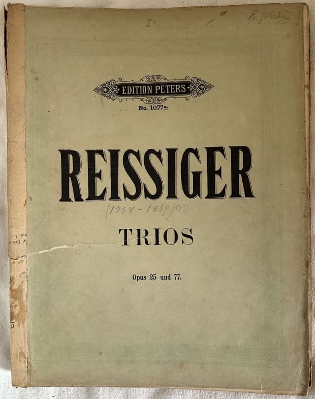 Edizione di fine ottocento o inizi novecento della melodia "Trio fur piano violine und violoncell" dall'opera 25 di Carl Gottlieb Reissiger (1798-1859). All'interno partitura per violino violoncello e pianoforte. In discrete condizioni. Copertina editoriale in discrete condizioni generali con lievi usure ai margini e dorso. Strappo. Dorso coperto da carta. Legatura in discrete condizioni. Pagine in buone condizioni con fioriture. In folio. cm. 31x24. Pp. 99, 15, 15.Edition of late 19th century of early 20th century of the melody "Trio fur piano violine und violoncell" from the opera 25 by Carl Gottlieb Reissiger (1798-1859). There are the complete scores of piano, violin and violoncello. In fair conditions. Editorial cover in fair conditions lightly worn in the extremities. Tear. Spine covered by paper. Binding in fair conditions. Pages in good conditions with foxing. In folio. cm. 31x24. Pp. 99, 15, 15.