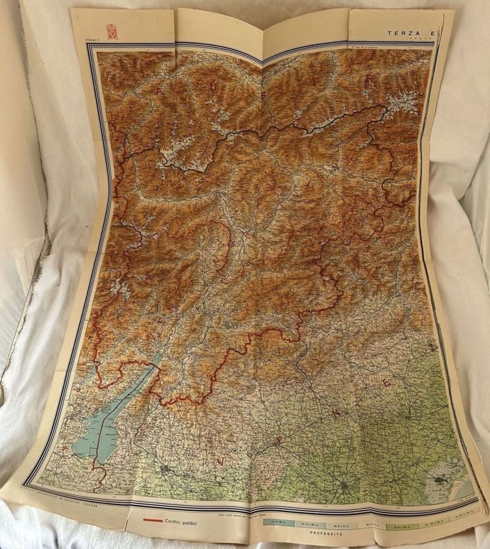 Carta ipsometrica del territorio delle Tre Venezie (Venezia Tridentina, Venezia Propria, Venezia Giulia). La mappa è formata da due fogli separati. Di grandi dimensioni. TECNICA: Litografia AUTORE: Istituto Geografico Militare<BR>DIMENSIONI FOGLIO: cm 105x134 DIMENSIONI INCISIONE: cm 93x103,5<BR>EPOCA: 1930-3 In discrete condizioni. Fioriture. Qualche foro e strappo marginaliIpsometric map of the area of Tre Venezie (Venezia Tridentina, Venezia Propria, Venezia Giulia). TECHNIQUE: Lythography AUTORE: Istituto Geografico Militare PAGE SIZE: cm 105x134PRINT'S SIZE: 93x103,5 PERIOD: 1930-31 In fair conditions. Foxing. Little hole and tears in the edges.