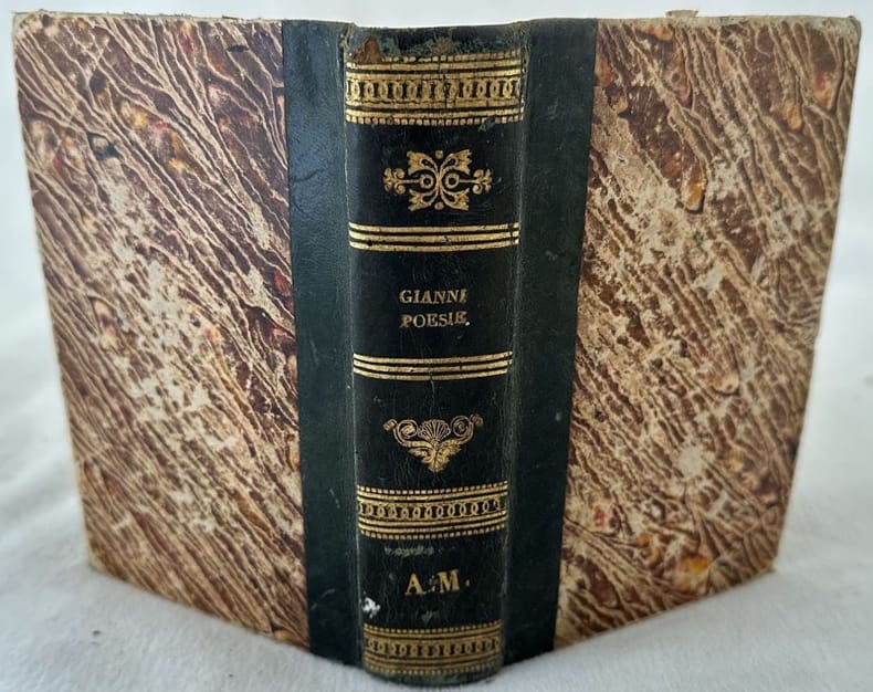 Prima edizione del 1807 di questa raccolta delle poesie del poeta e improvvisatore italiano Francesco Gianni (Roma 1750-Parigi 1822). Celebri le esibizioni pubbliche dell'autore a Genova e Milano dove ebbe molto successo. Talmente tanto che la sua fama si allargò a tutta la penisola e venne assunto da Napoleone I prima come membro del consiglio legislativo della repubblica Cisalpina e successivamente come improvvisatore di corte. L'opera è formata da cinque tomi legati insieme ed è completa. In ottime condizioni. Copertina in mezza pelle coeva con titolo e decorazioni in oro al dorso in buone condizioni generali con lievi usure ai margini e dorso. Legatura in buone condizioni. All'interno le pagine si presentano in buone condizioni con rare fioriture. In 16. Dim. 15x10 cm. Pp. 132+120+108+144+108.First edition of 1807 of this collection of poems by the italian poet and improviser Francesco Gianni (Roma 1750-Parigi 1822). He was well known for his exibitions in Genoa and Milan where he had a huge success. So much that Napoleone I decided to pay to be a member of the Council initially then his private improviser. The work is made up of five tomes and it is complete Half leather coeval cover with gilted title and decorations in the spine in good general conditions lightly worn in the extremities. Binding in good conditions. Pages in good conditions with occasional foxing. In 16. Dim. 15x10 cm. Pp. 132+120+108+144+108.
