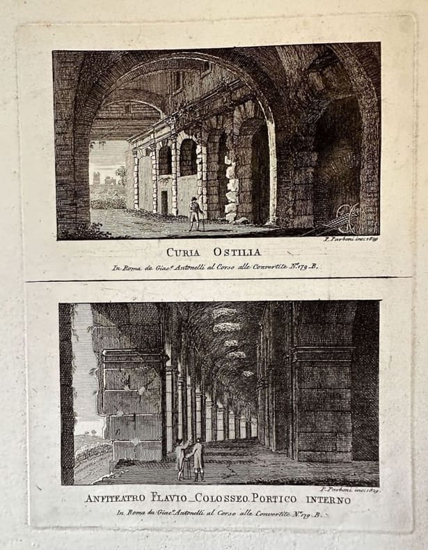 Finissima tavola del 1829, due vedute di Roma incise da Achille Parboni (Roma sec. XVIII-XIX) attivo a Roma, insieme al fratello Pietro, nella prima metà del XIX secolo. La veduta animata mostra la Curia Ostilia e l'Anfiteatro Flavio Colosseo portico interno. AUTORE: Achille Parboni ATLANTE: Nuova raccolta delle Principali vedute Antiche e moderne dell'alma città di Roma e sue vicinanze EPOCA: 1829 TECNICA: Incisione a bulino DIMENSIONI FOGLIO: cm 25,5x19 DIMENSIONI INCISIONE: cm 18x13,5 CONDIZIONI: Ottime. Very fine plate of 1829, two views of Rome engraved by Achille Parboni (Roma sec. XVIII-XIX) active in Rome, together with his brother Pietro, in the first half of XIX century. The animated view shows rupe Tarpea and parts of Foro di Nerva. AUTHOR: Achille Parboni ATLAS: Nuova raccolta delle Principali vedute Antiche e moderne dell'alma città di ROma e sue vicinanze TECHNIQUE: Burin engraving LEAF DIMENSION: cm 25,5x19 ENGRAVING DIMENSION: cm 18x13,5 DATE: 1829 CONDITIONS: Very good conditions<BR><BR>