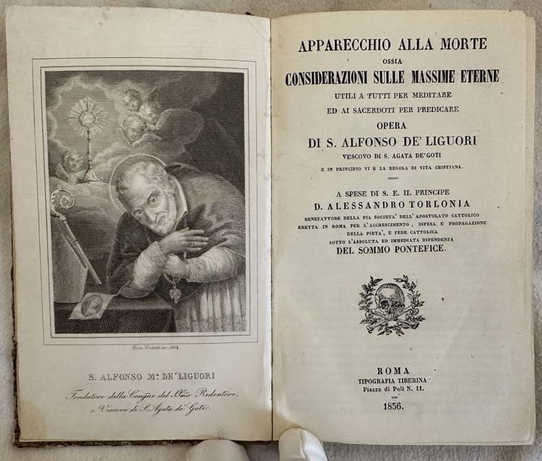 Edizione del 1856 di questa interessante opera di Alfonso de Liguori (1696-1787) sulla morte. Ritratto di de Liguori in antiporta incisa da Giuseppe Mochetti nel 1854 incisore attivo a Roma tra il 1806 e il 1835 circa. De Liguori ha avuto un ruolo chiave nel dibattito del periodo tra il Giansenismo ed il significato preciso della legge, dimostrandosi come il più famoso ed influente. I suoi manuali sono quelli che hanno saputo dare più risposte ai dubbi che pervadevano la cristianità, e sono stati delle pietre miliari per i successivi del XIX secolo. In buone condizioni. Copertina in mezza tela coeva in buone condizioni generali con lievi usure ai margini e dorso. Legatura in buone condizioni. All'interno le pagine si presentano in buone condizioni con fioriture. In 16. 17,5x11 cm. Pp. 268.Edition of 1856 of this interesting work by Alfonso de Liguori (1696-1787), about death. Portrait of de Liguori in the frontspice engraved by Giuseppe Mochetti in 1854 engraver active between 1806 and1835 circa. De Liguori had a key role on the debate between Jansenism and the precise meaning of the law, and he was the most famous and influent christian man in that times. His books more than others managed to give answers to the doubt that Christians had in that time, and became milestones for the following books written in the XIX century. In good conditions. Half cloth coeval cover in good general conditions lightly worn in the extremities. Binding in good conditions. Pages in good conditions with foxing. In 16. 17,5x11 cm. Pp. 268.
