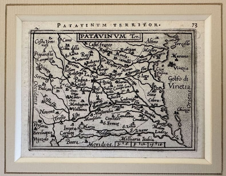 Mappa originale del 1601 del territorio di Padova di Abraham Ortelius (1527-1598) montata su elegante passepartout. INCISIONE: Acquaforte su rame AUTORE: Abraham Ortelius (1527-1598) ATLANTE: Epitome theatri Orteliani - Antuerpiae, Joannem Bapt. Urientium DIMENSIONI PASSEPARTOUT: cm 23x26 DIMENSIONI INCISIONE: cm 9x12 EPOCA: 1601 CONDIZIONI: ottime condizioni. Original map of 1601 of the territory of Padoa by Abraham Ortelius (1527-1598) mounted on an elegant passepartout. ENGRAVING: Copper etching AUTHOR: Abraham Ortelius (1527-1598) ATLAS: Epitome theatri Orteliani - Antuerpiae, Joannem Bapt. Urientium SIZE OF PASSEPARTOUT: cm 23x26 SIZE OF THE ENGRAVING: cm 9x12 PERIOD: 1601 CONDITIONS: very good conditions<BR><BR>