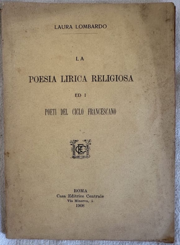 Interessante pubblicazione del 1908 sulla poesia lirica religiosa e i poeti del ciclo francescano scritta da Laura Lombardo. Gran parte dedicata a Iacopo Benedetto da Todi detto Jacopone da Todi. In buone condizioni. Copertina editoriale in buone condizioni con lievi usure ai margini e dorso. Legatura in discrete condizioni con lievi rotture. Pagine in ottime condizioni generali con rare fioriture. In 16. Dim. 17x12 cm. Pp. 60.interesting pamphlet of 1908 about religious lyric poet and poets of franciscan cycle written by Laura Lombardo. Wide part is dedicated to Iacopo Benedetto da Todi also known as Jacopone da Todi. In good conditions. Editorial cover in good conditions lightly worn in the extremities. Binding in fair general conditions with light cracks. Inside pages are in very good conditions with occasional foxing. In 16. Dim. 17x12 cm. Pp. 60.