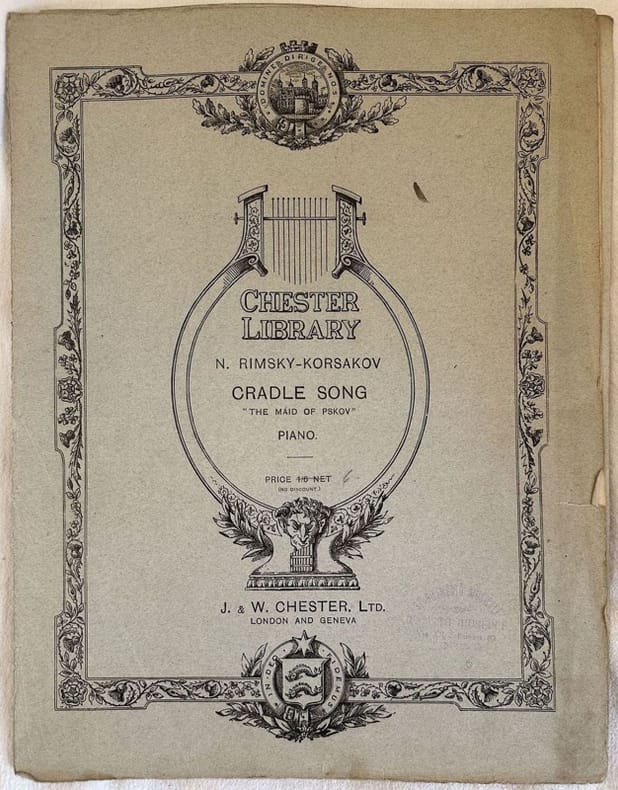 Edizione dei primi del novecento della melodia "The maid of Pskov" di Nikolai Andreyevich Rimsky Koraskov (1831-1870). In discrete condizioni. Copertina editoriale in discrete condizioni con lievi usure marginali. Piatti staccati. Legatura in buone condizioni. Pagine in buone condizioni con fioriture. In folio. cm. 33,5x26. Pp. 3.Edition of early 20th century of the melody "The maid of Pskov" by Nikolai Andreyevich Rimsky Koraskov (1831-1870). In fair conditions. Editorial cover in fair conditions lightly worn in the extremities. Plates detached. Binding in good conditions. Pages in good conditions with foxing. In folio. cm. 33,5x26. Pp. 3.