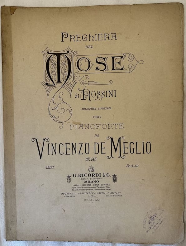 Edizione Rircordi della melodia "Preghiera del Mosè di Rossini". Trascrizione e variazione per pianoforte del compositore napoletano Vincenzo De Meglio (1825-1883). Timbro a secco illeggibile ma della fine dell'ottocento o inizi novecento. In buone condizioni. Copertina editoriale in buone condizioni con lievi usure marginali. Rinforzo di carta al dorso. Legatura in buone condizioni. Pagine in buone condizioni con rare fioriture e strappi marginali. In Folio. cm. 34,5x26. Pp. 9.Ricordi edition of the melody "Preghiera del Mosè di Rossini". Transcription and variation for piano by the composer from Neaples Vincenzo De Meglio (1825-1883). Unreadable embossed stampo but of late 19th century or early 20th century. In good conditions. Editorial cover in good conditions lightly worn in the extremities. Reinforcement of paper in the spine. Binding in good conditions. Pages in good conditions with occasional foxing and tears in the edges. In Folio. cm. 34,5x26,5. Pp. 9.
