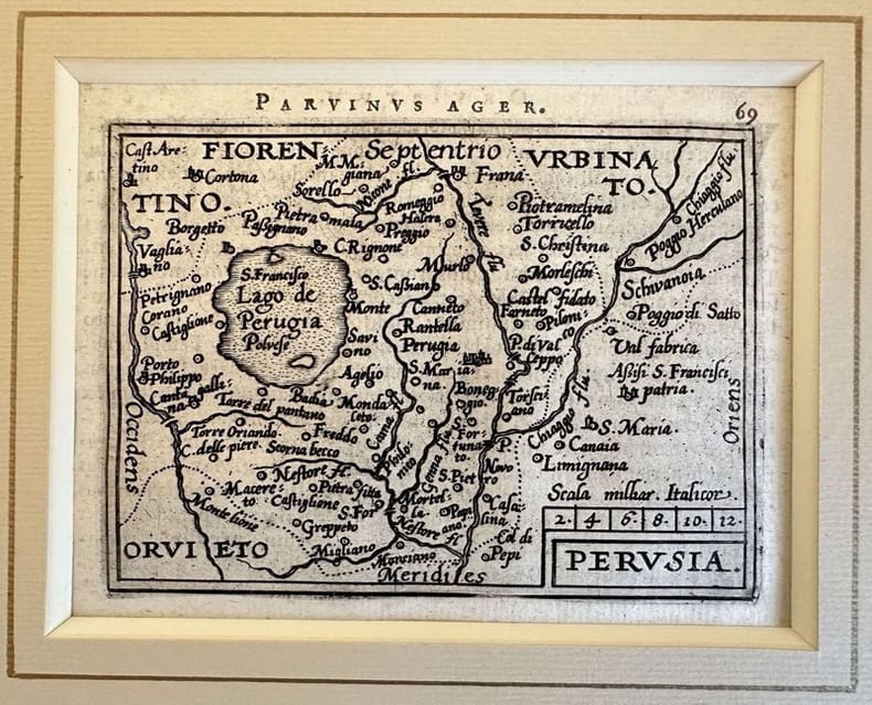 Mappa originale del 1601 del territorio di Perugia di Abraham Ortelius (1527-1598) montata su elegante passepartout. INCISIONE: Acquaforte su rame AUTORE: Abraham Ortelius (1527-1598) ATLANTE: Epitome theatri Orteliani - Antuerpiae, Joannem Bapt. Urientium DIMENSIONI PASSEPARTOUT: cm 23x26 DIMENSIONI INCISIONE: cm 9x12 EPOCA: 1601 CONDIZIONI: ottime condizioniOriginal map of 1601 of the territory of Perugia by Abraham Ortelius (1527-1598) mounted on an elegant passepartout. ENGRAVING: Copper etching AUTHOR: Abraham Ortelius (1527-1598) ATLAS: Epitome theatri Orteliani - Antuerpiae, Joannem Bapt. Urientium SIZE OF PASSEPARTOUT: cm 23x26 SIZE OF THE ENGRAVING: cm 9x12 PERIOD: 1601 CONDITIONS: very good conditions