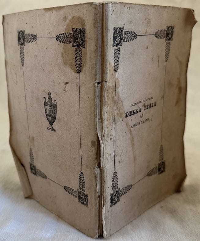 Edizione del 1842 di questa opera sulla cura specifica per la rimozione della tenia dal corpo umano scritto da Giuseppe Ciani medico romano. All'interno: Della genesi de vermi appartenenti alla specie umana e degli effetti e fenomeni morbosi quali essi producono sulla umana economia; Classificazione succinta delle diverse specie de vermi umani e loro varietà; Della tenia; Del metodo specifico di cura e rimedio egualmente specifico per espellere la tenia di qualunque specie; Casi incontrati dall'autore nei quali furono rimarcate alcune particolarità nelle tenie evacuate; Alcune esperienze di una tenia lata ecc... Alla fine una tavola ripiegata. In discrete condizioni. Copertina editoriale in discrete condizioni generali con usure ai margini e dorso. Legatura in buone condizioni. All'interno le pagine si presentano in buone condizioni con fioriture. In 8. Dim. 19,5x13 cm. Pp. 56+1 tav. Edizione del 1842 of this work about the specific treatment for the remotion of tenia from human body written by Giuseppe Ciani medico romano. Inside: Della genesi de vermi appartenenti alla specie umana e degli effetti e fenomeni morbosi quali essi producono sulla umana economia; Classificazione succinta delle diverse specie de vermi umani e loro varietà; Della tenia; Del metodo specifico di cura e rimedio egualmente specifico per espellere la tenia di qualunque specie; Casi incontrati dall'autore nei quali furono rimarcate alcune particolarità nelle tenie evacuate; Alcune esperienze di una tenia lata ecc... At the end a folded plate. In fair conditions. Editorial cover in fair general conditions with wearings in the spine. Binding in good conditions. Inside pages are in good conditions with foxing. In 8. Dim. 19,5x13 cm. Pp. 56+1 tav.